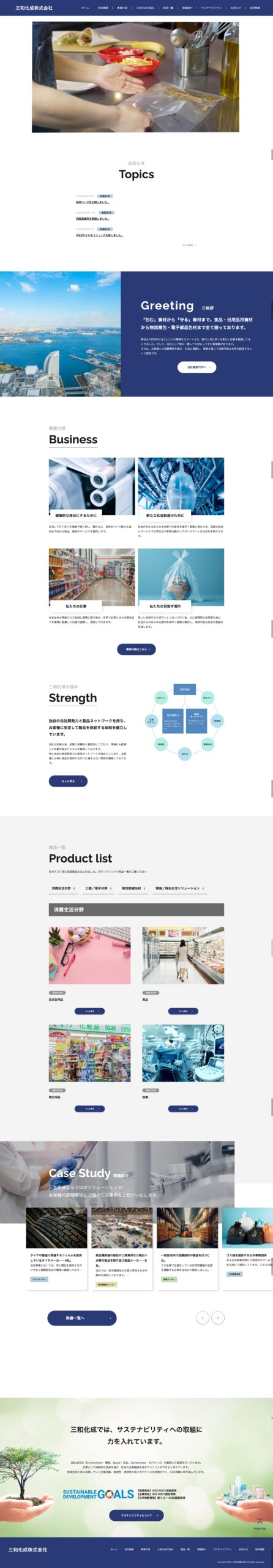- ポリエチレン、ポリプロピレン、ポリスチレン、ウレタンシート等各種合成樹脂を素材としたプラスティック製品の製造・販売及び商品開発を行なっている「三和化成株式会社」様のコーポレートサイトをリニューアルさせていただきました。