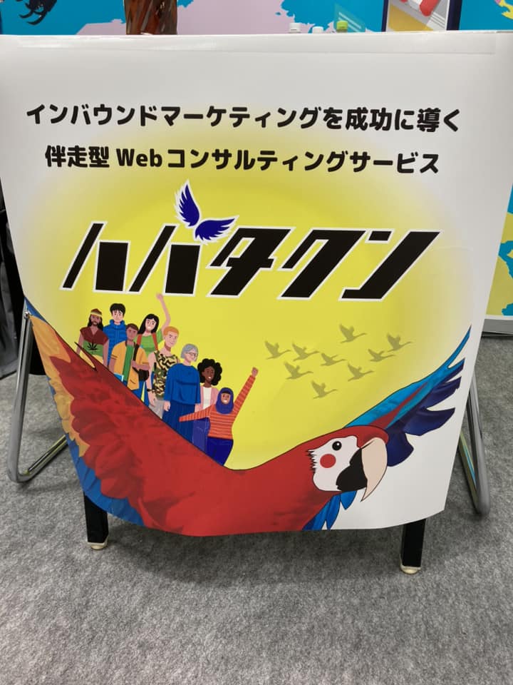 今回は、パートナー企業様である合同会社ホリデーアーチ、株式会社以心伝心と3社合同で出展いたしました。弊社のメインサービスである「定額制専属WebマーケティングサービスASHINAMI」と、ホリデーアーチ社の得意とする店舗向けインバウンドマーケティング、以心伝心社の得意とする動画制作を組み合わせ、”世界に向けて羽ばたく事業へ”をコンセプトにした「ハバタクン」というサービスにて出展をおここない、多くのお客様にご来場いただき、ご興味をお持ちいただくことができました。